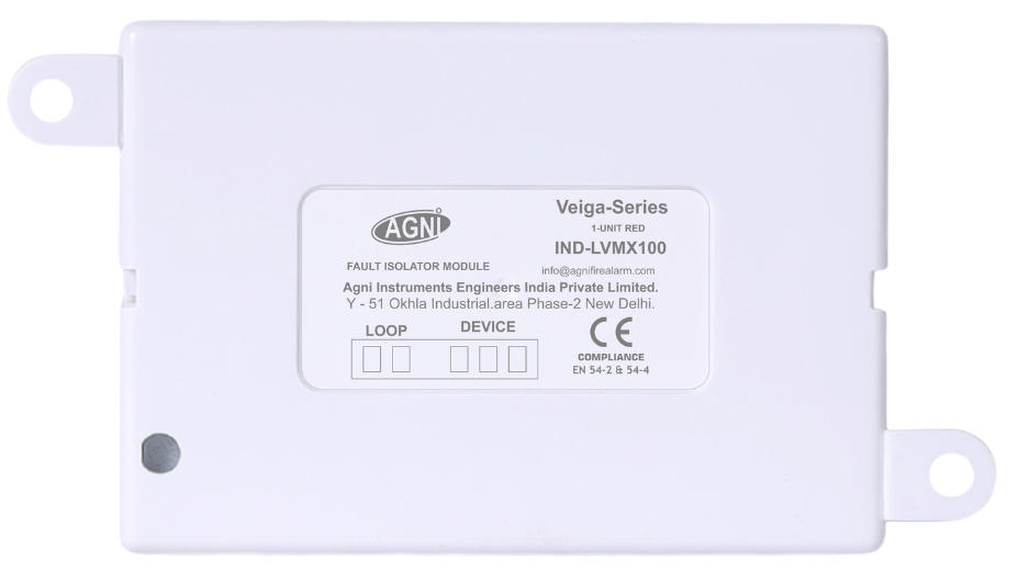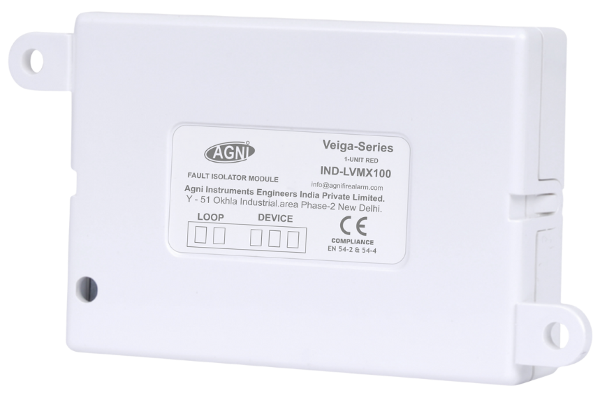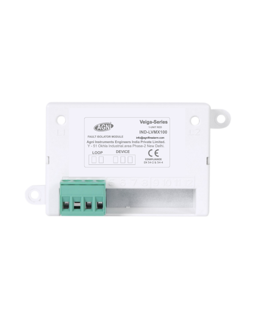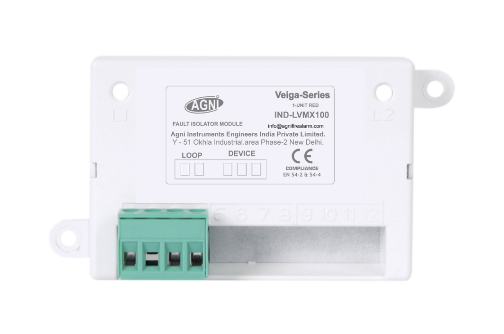 The Agni Veiga Intelligent Isolator Module (IND-LVMX-100) is designed to Protect intelligent addressable A Class A fire alarm loop with fault isolators provides maximum reliability by creating a redundant, bidirectional wire path that returns to the panel. ensuring uninterrupted system operation and fast fault recovery.