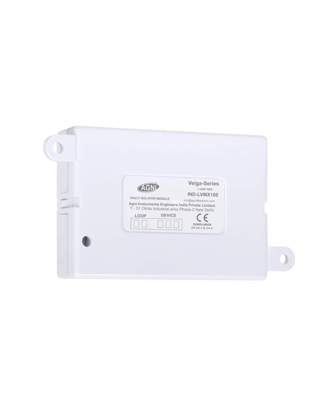 The Agni Veiga Intelligent Isolator Module (IND-LVMX-100) is designed to Protect intelligent addressable A Class A fire alarm loop with fault isolators provides maximum redundant, bidirectional wire path that returns to the panel. ensuring uninterrupted system operation and fast fault recovery.
